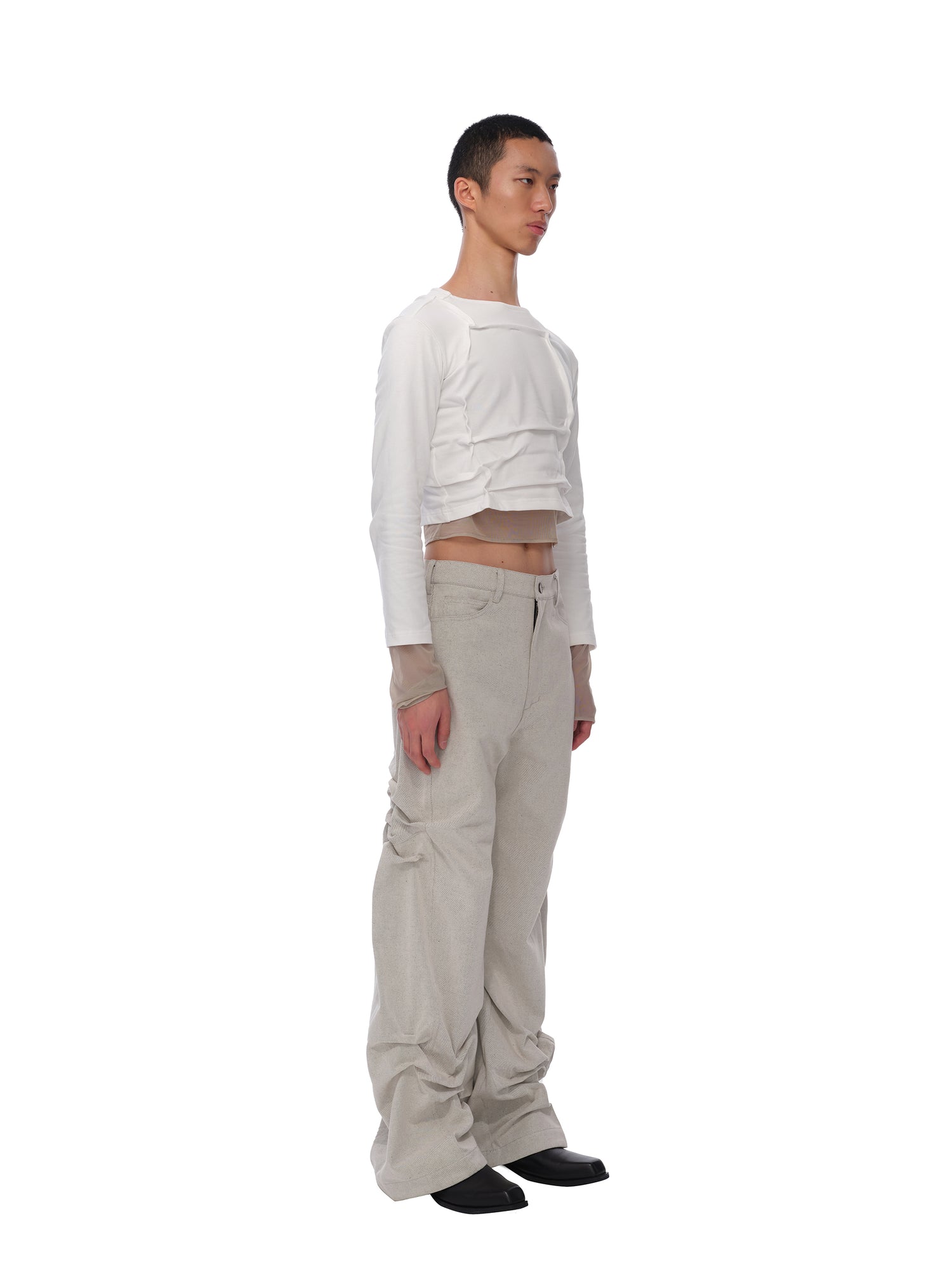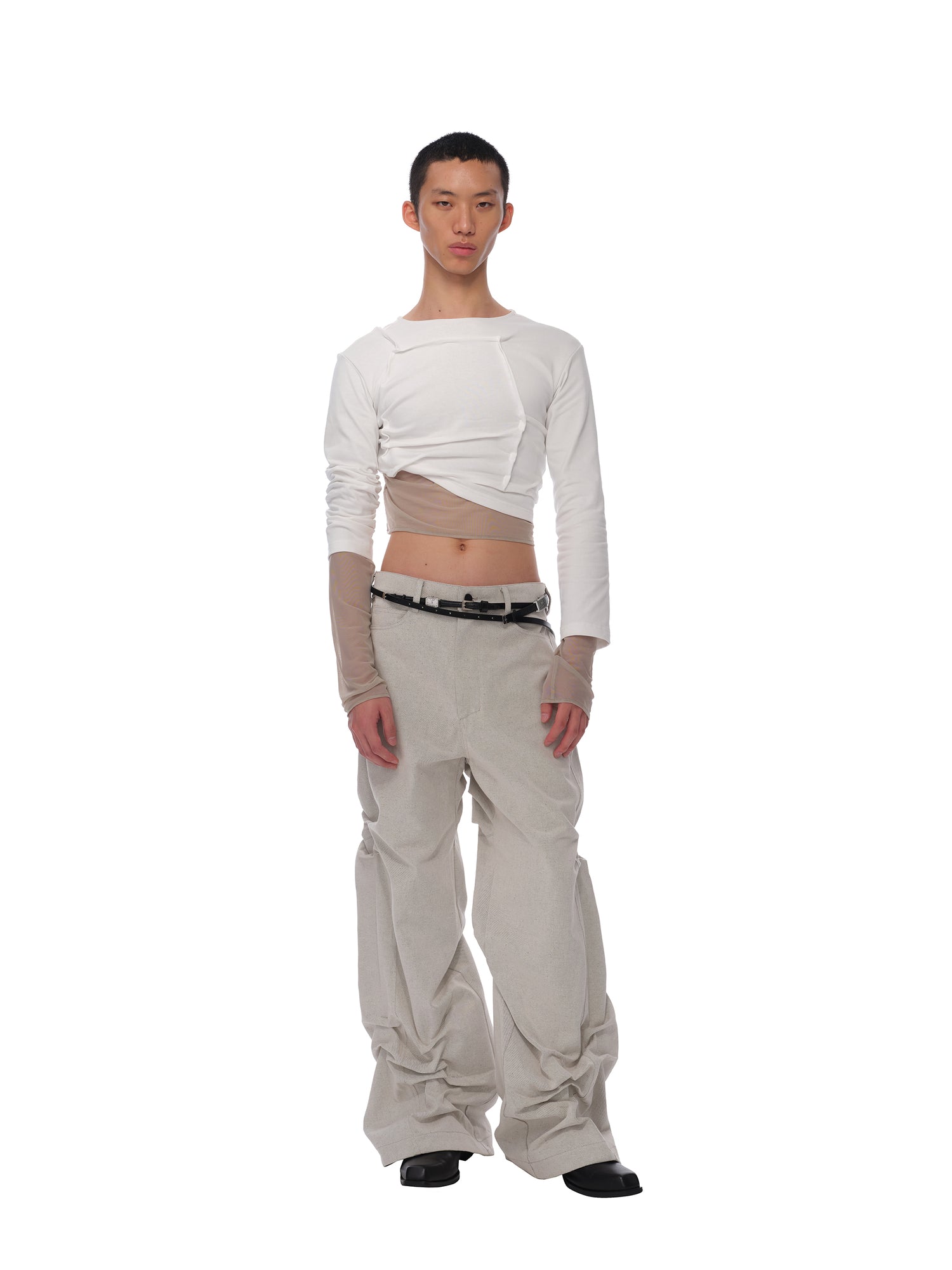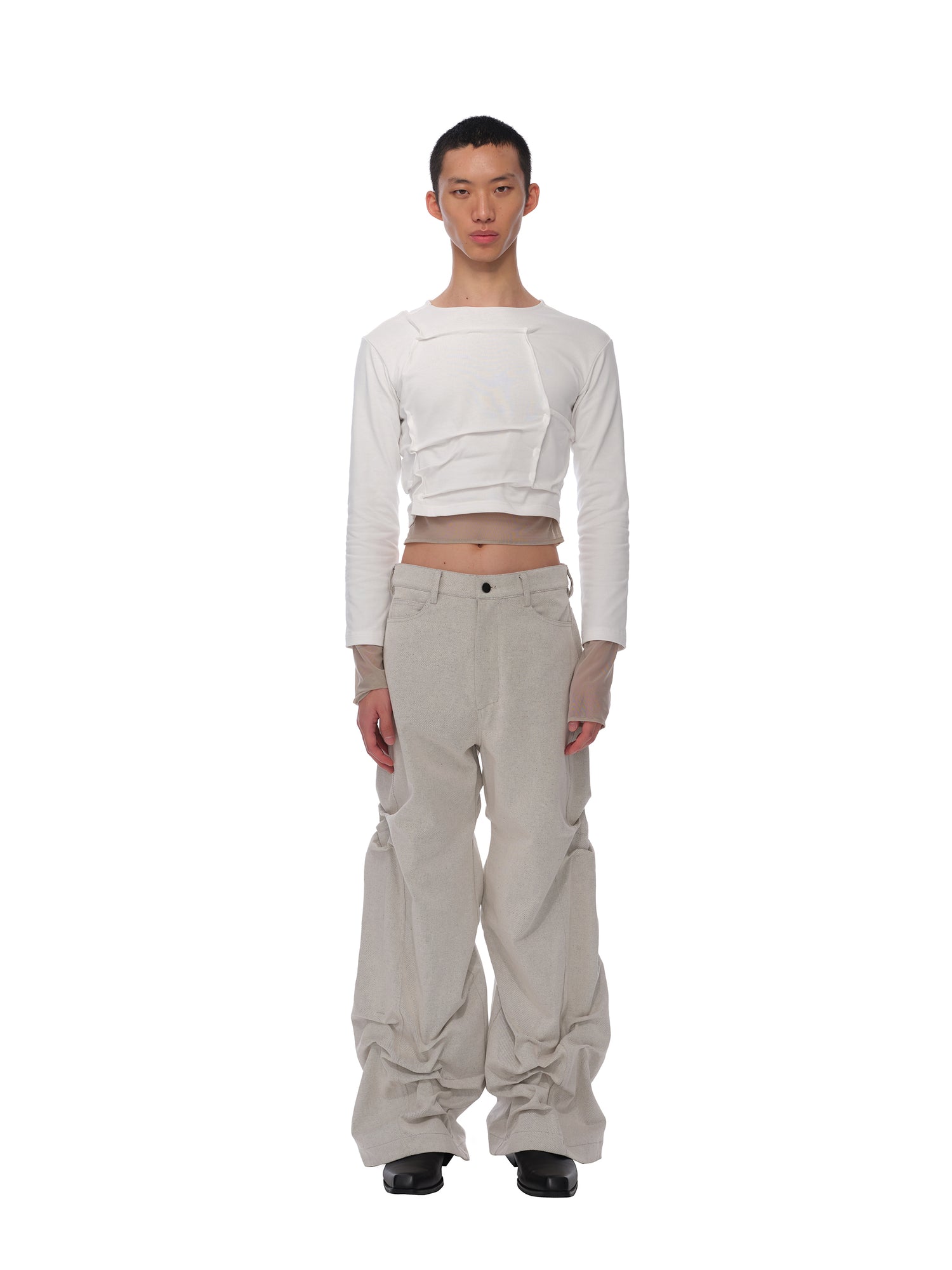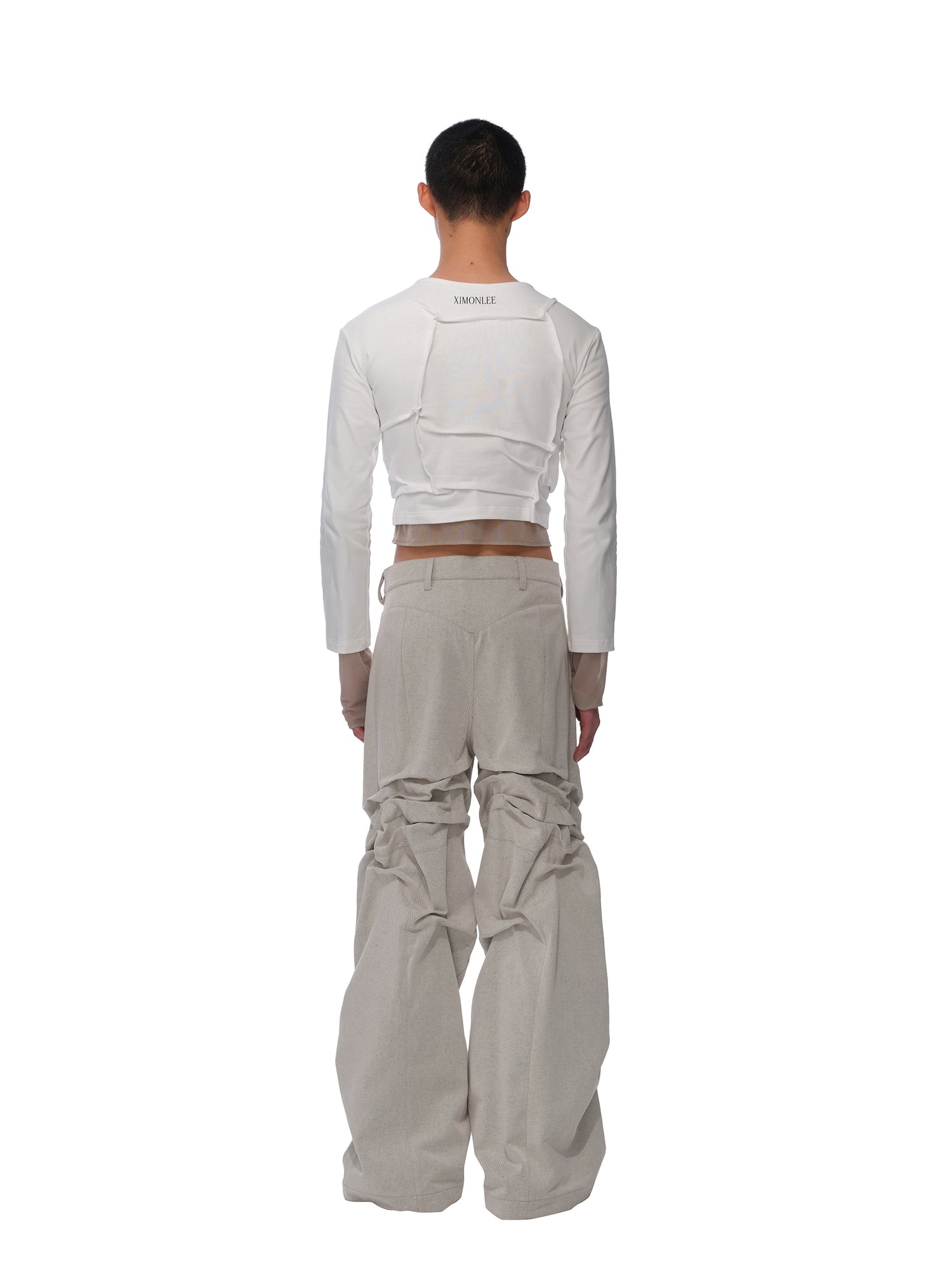 Irregular tuck details. Brand logo print. Under mesh layers. Moderately stretchy fabric. Tight fit.