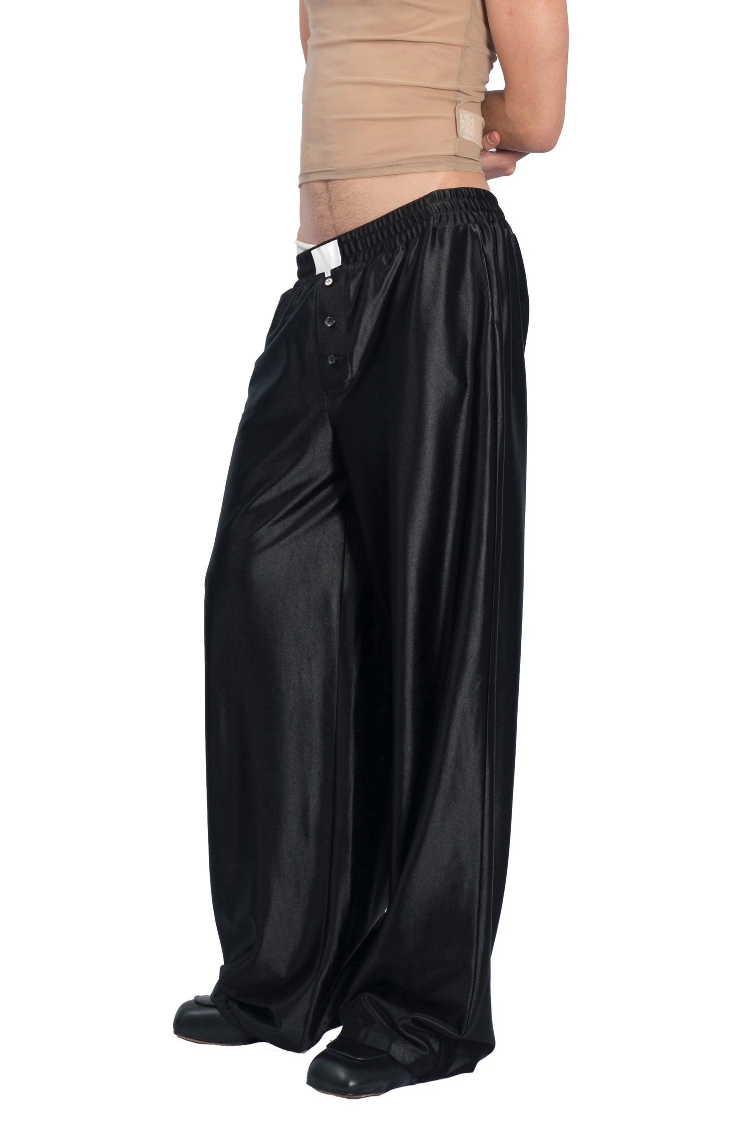 Faux fly with button details. Elasticated waistband. Wide and straight leg. Side pockets. Integrated jockstrap. Patch design on the right back.